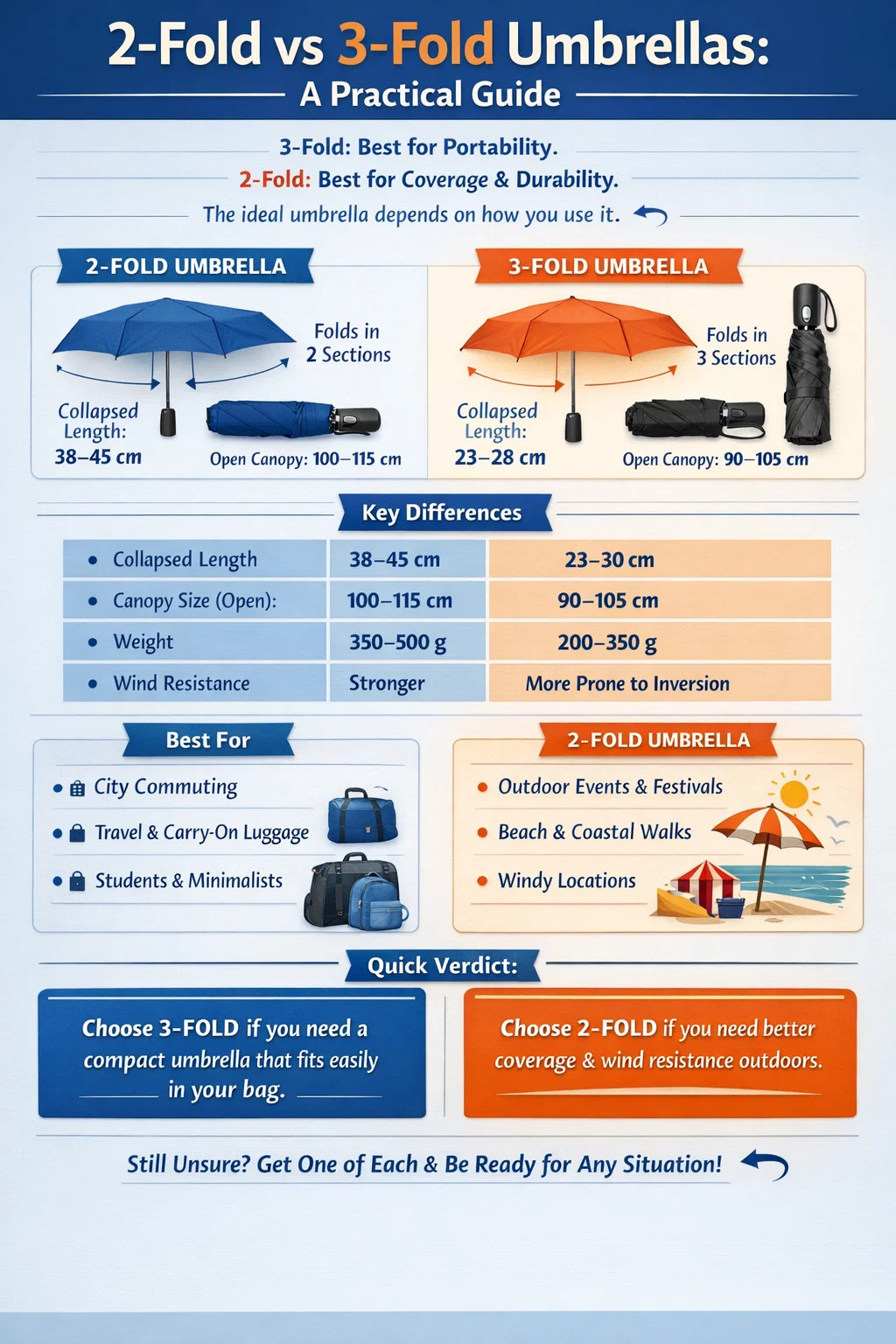 Günlük işe gidip gelme, ofis kullanımı veya çanta alanının kısıtlı olduğu seyahatler için şemsiyeye ihtiyacınız varsa, 3 katlı bir şemsiye neredeyse her zaman daha iyi bir seçimdir . Yaklaşık 23-28 cm kadar çökebiliyor, ceket cebine veya küçük bir el çantasına sığabiliyor ve fark edilmeden taşınabilecek kadar hafif. Öte yandan, dışarıda çok fazla zaman harcıyorsanız - ister plaja, ister stadyuma, ister bir ülke fuarına gidiyor olun - 2 katlı bir şemsiye, taşıması daha hantal olma pahasına size fark edilir derecede daha büyük bir gölgelik, daha sağlam bir çerçeve ve daha iyi rüzgar direnci sağlar.