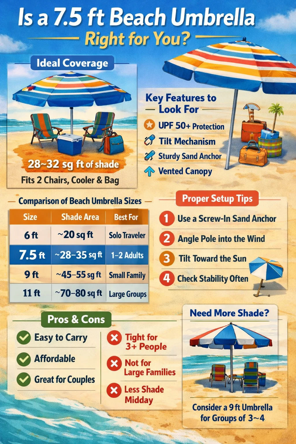 Bu boyut aralığındaki bir plaj şemsiyesi, malzemeye bağlı olarak genellikle 3,5 ila 6 pound arasında bir ağırlığa sahiptir; arabadan kıyıya hiç terlemeden taşınabilecek kadar hafiftir. Direğin çapı genellikle 1 inç ila 1,5 inç arasındadır ve gölgelik, güneş doğrudan tepedeyken rahatça altında durabilecek kadar yüksekte oturur. Bu boyutlar, rahat plaj kullanımı, yalnız seyahat edenler ve büyük bir teçhizat taşımadan güvenilir gölge isteyen çiftler için 7,5 ft'yi standart haline getiriyor.