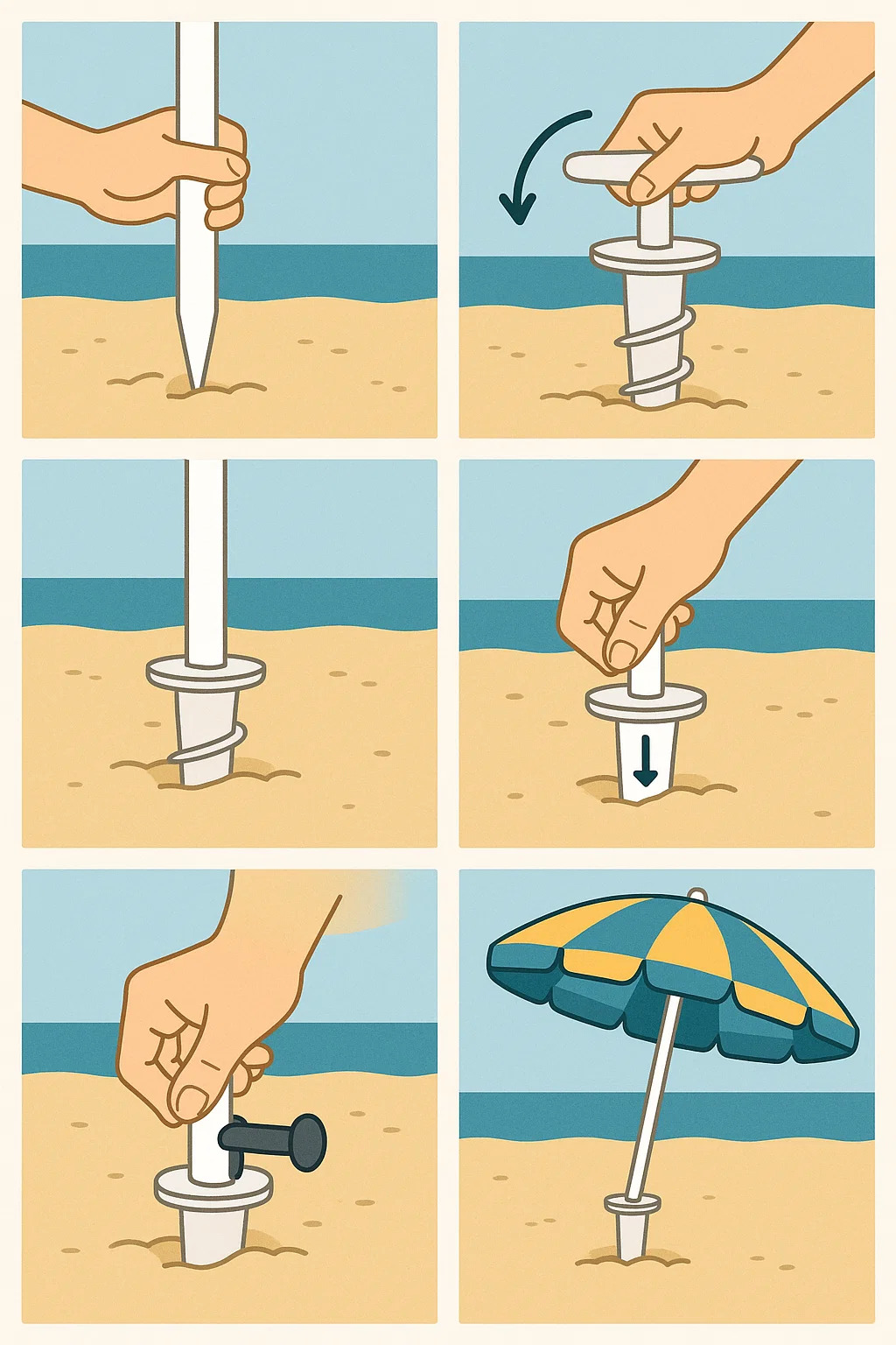 Kum çapasını veya plaj şemsiyesi direğinin sivri ucunu vida tabanıyla seçilen yere yerleştirin.