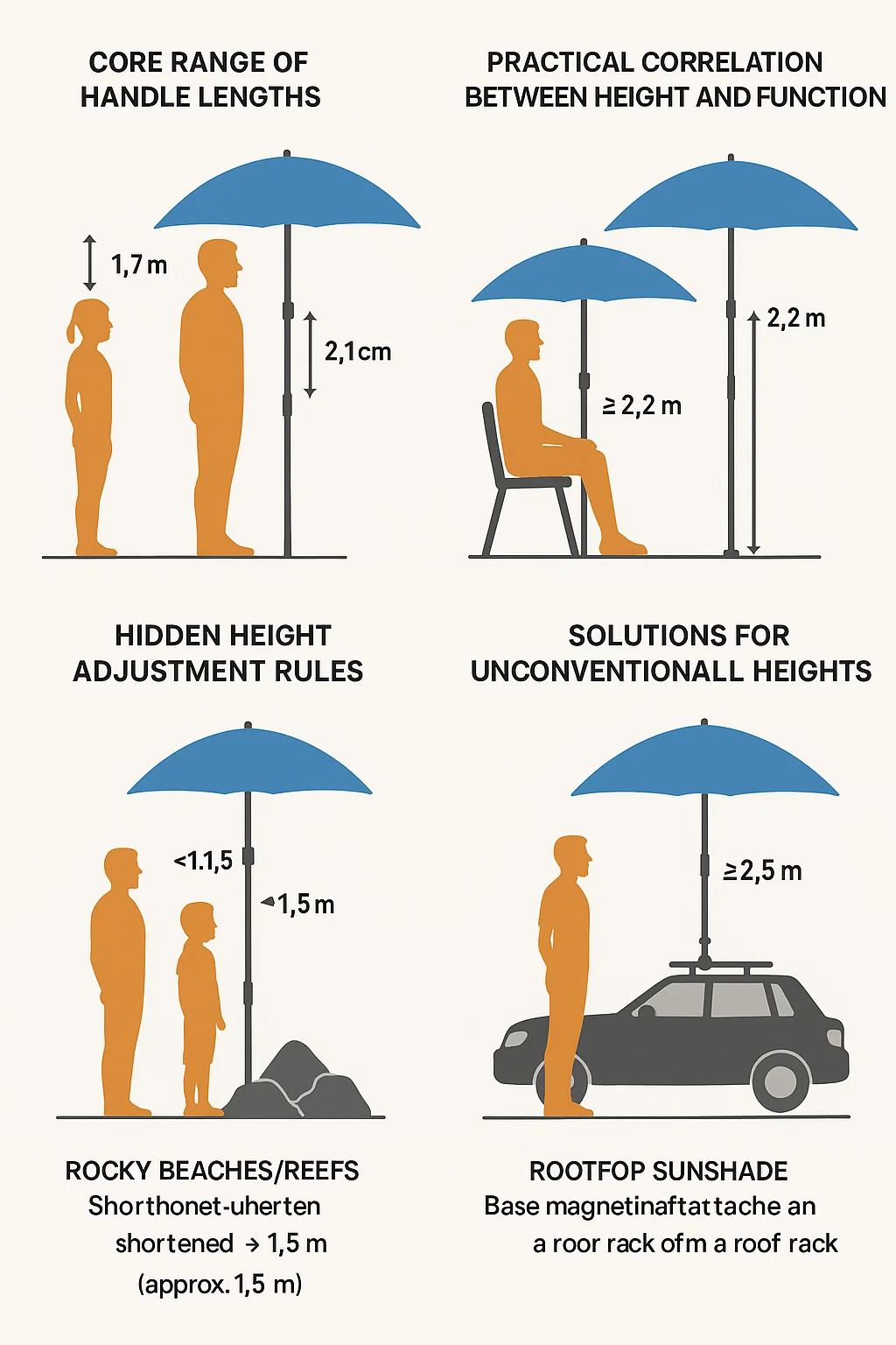 Aşağıda pratik bir analiz yer almaktadır: plaj şemsiyesi ortak kullanım senaryolarına ve ergonomik tasarım ilkelerine dayalı yükseklikler:
