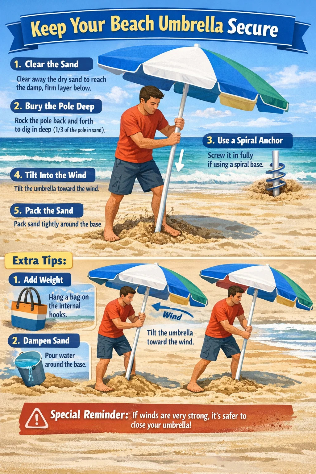 sağlamak için plaj şemsiyesi Deniz melteminde sabit kalması ve uçup gitmemesi için birkaç kurulum püf noktası çok önemlidir. Bu adımları takip etmeniz şemsiyenizin rüzgar tarafından sürüklenme riskini önemli ölçüde azaltacaktır: