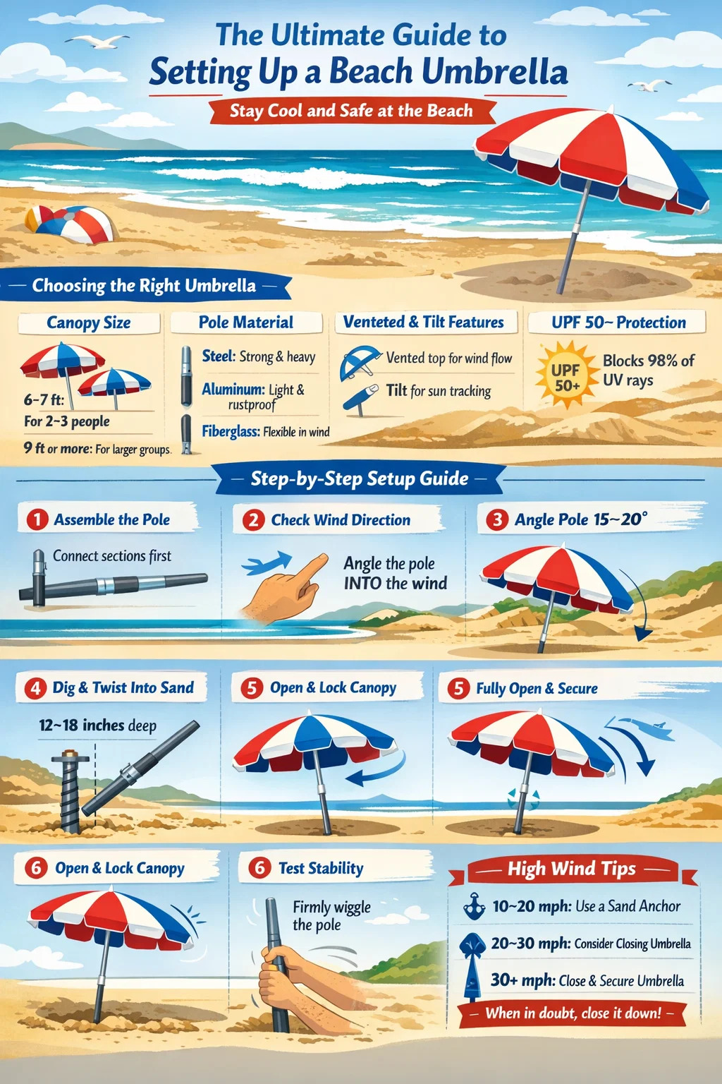 Bir kurulum plaj şemsiyesi Adımları öğrendikten sonra doğru bir şekilde beş dakikadan az sürer; ancak bunu yanlış yapmak, şemsiyenizin rüzgarda devrilmesi, ihtiyacınız olan yerde gölge sağlayamaması veya daha kötüsü yakındaki plaja gidenler için tehlike oluşturması anlamına gelir. Temel süreç: rüzgar korumalı bir nokta seçin, direği rüzgara doğru 15-20 derece açıyla açın, en az 12-18 inç kuma batırın ve bir kum ankrajıyla veya direği daha derine çevirerek sabitleyin. Geriye kalan her şey bu temel üzerine kuruludur.