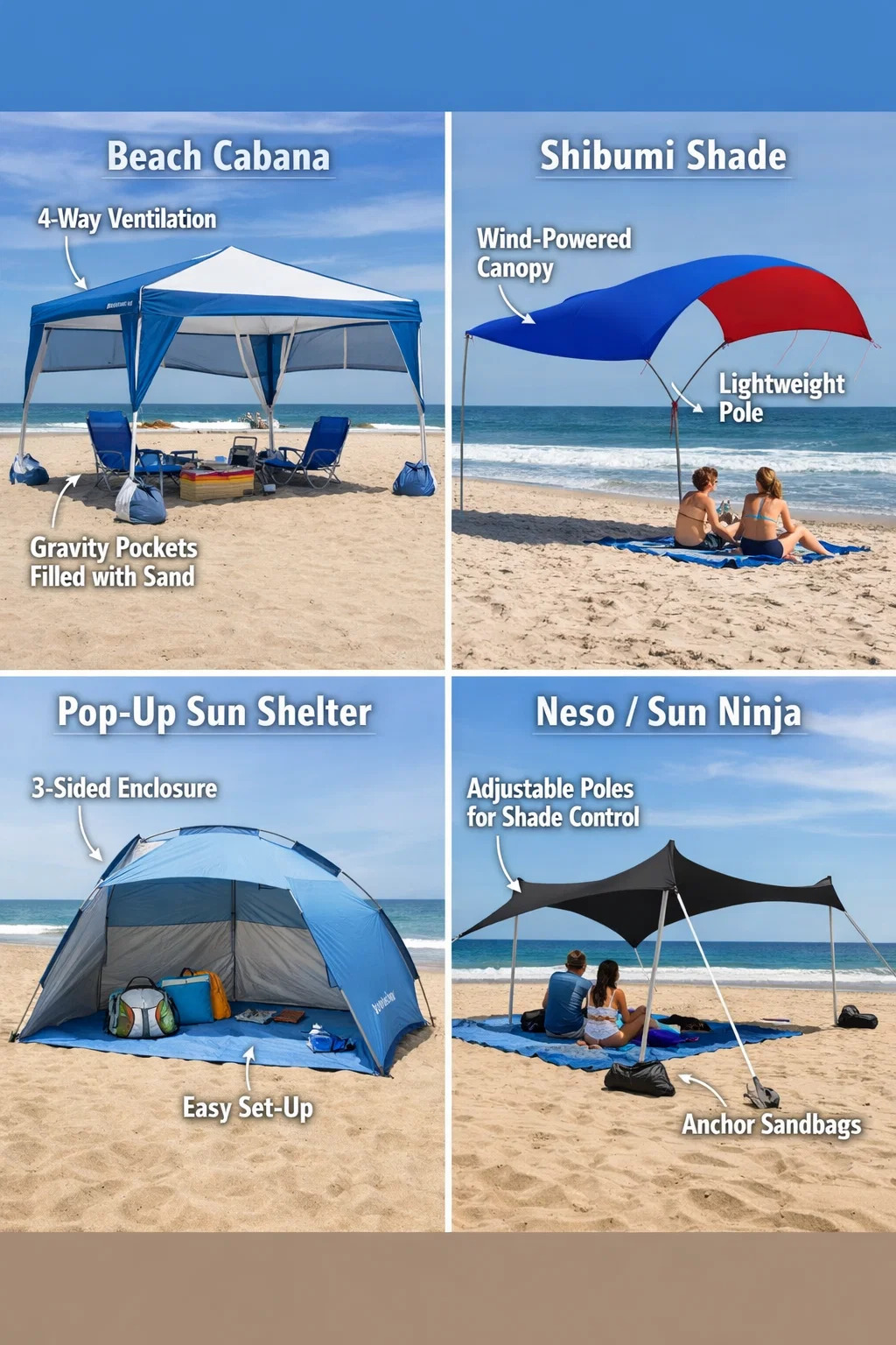 Gelişmiş Deneyim: Dört yönlü havalandırma, deniz meltemlerinin geçmesine izin vererek çadırın havasız kalmasını önlerken, tipik bir plaj şemsiyesinin iki katından fazla güneş koruma alanı sağlar.