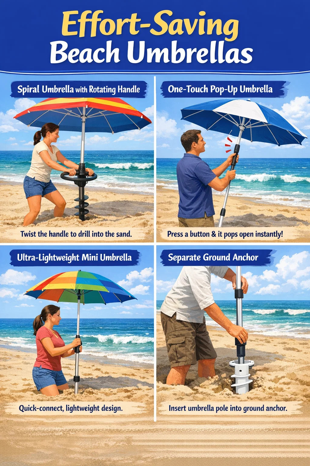 Çaba tasarrufu sağlayan fayda: Kaldıraç ilkesini kullanarak, daha az güce sahip kadınlar veya yaşlılar bile şemsiyeyi kolaylıkla kumun derinliklerine gömebilir.